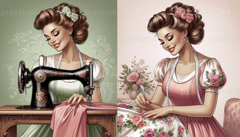 Девушка, нарисованная в качестве швеи на старинной швейной машине, Ai generated image