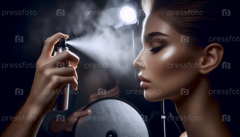 Лицо модели, которое во время фотосессии мягко стирается спреем настройки, Ai generated image