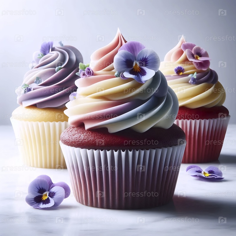 Стол из трех вкусных, безупречно замороженных кексов с небольшим количеством съедобных цветов на мраморной плите Ai создал изображение