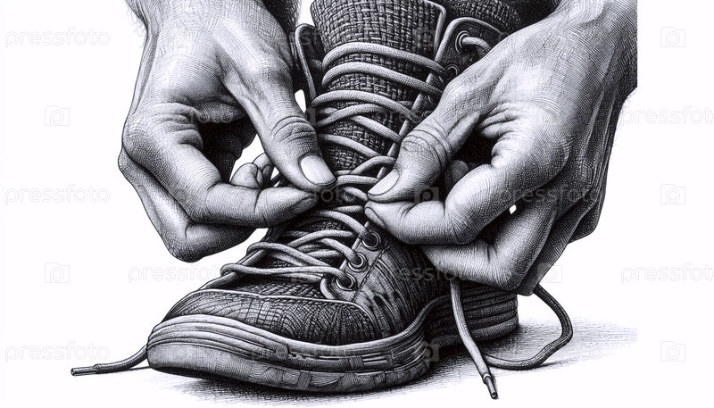 Руки, связывающие обувь Шнурки чернила рисование художественная печать, Ai generated image
