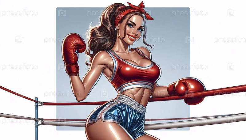 Пин-ап девушка в боксерских перчатках в классической позе борьбы, Ai generated image