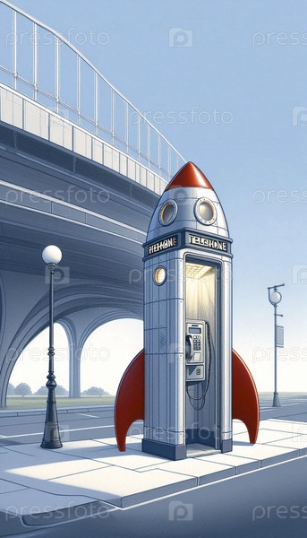 Ретро-футуристическая общественная телефонная будка в форме личного ракетного корабля, Ai generated image