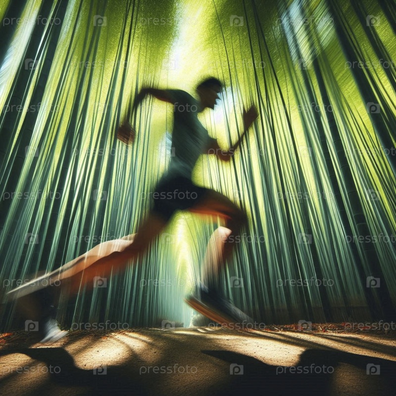 Бегущий по тропе в плавном движении на узкой дорожке через густой, зеленый бамбуковый лес Ai generated image