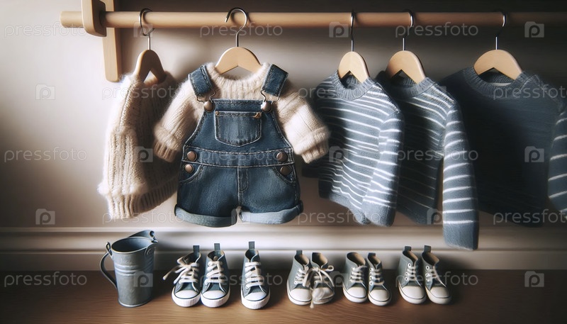 Милый, организованный шкаф с крошечной одеждой на миниатюрных вешальниках и маленькой обувью, выстроенной ниже, Ai generated image
