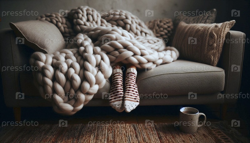 Ноги человека в удобных, несовместимых носках заглядывают из-под гигантского вязаного одеяла на диване, Ai generated image