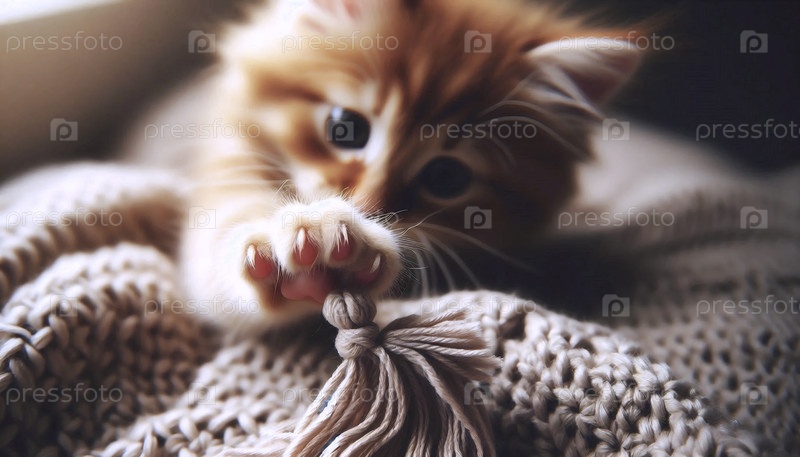 Мягкий оранжевый котенок, играющий своей крошечной лапой в углу вязаного одеяла, создал изображение