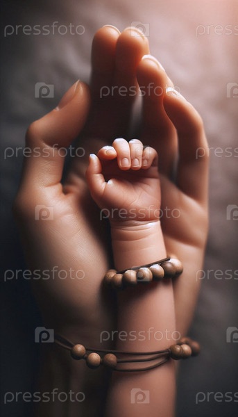 Крошечная рука ребенка хватает за палец взрослого, оба украшены простым браслетом с соответствующими бусинками, Ai generated image
