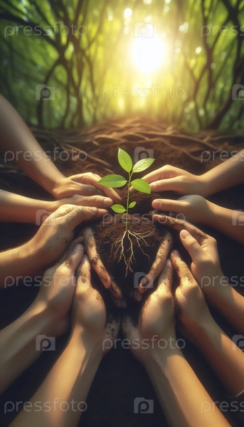 Универсальный символ нового начала: разнообразные руки сажают молодое дерево вместе, Ai generated image