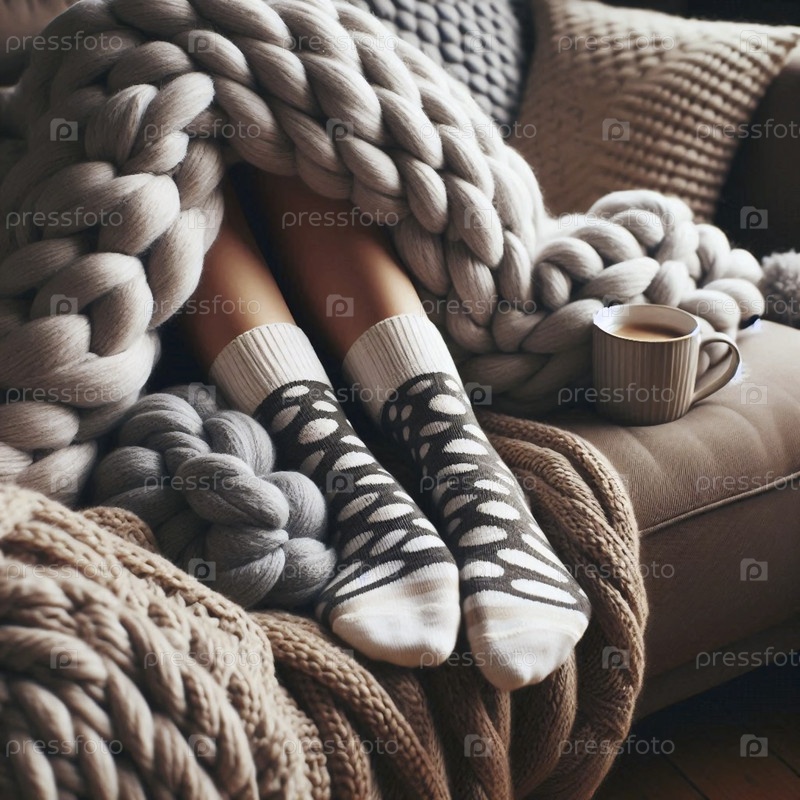 Ноги человека в удобных, несовместимых носках заглядывают из-под гигантского вязаного одеяла на диване, Ai generated image
