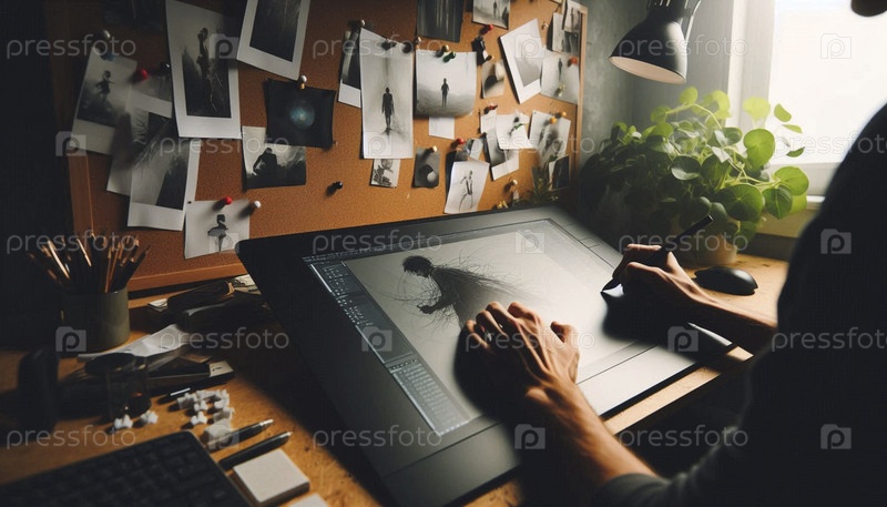 Креативные профессионалы сосредоточились на глубокой рабочей сессии в минималистической домашней студии, Ai создал изображение