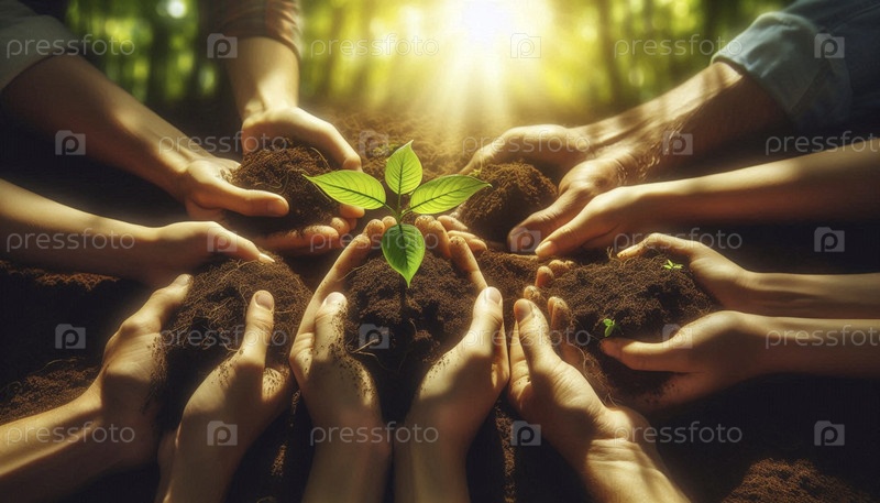 Универсальный символ нового начала: разнообразные руки сажают молодое дерево вместе, Ai generated image