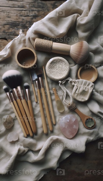 Массив чистых, устойчивых инструментов красоты на льняной ткани: бамбуковые кисти, мешок из сизаля, металлический гуа-ша, Ai generated image