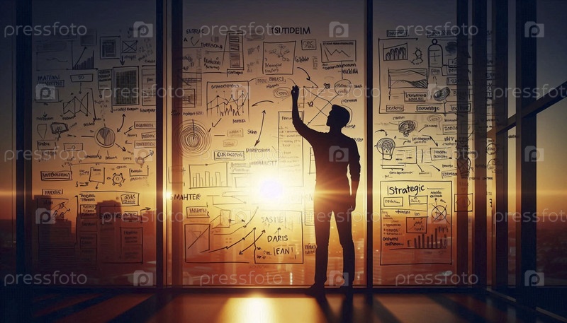 Вдумчивый лидер разрабатывает стратегию, в то время как пишет на стеклянной стене, заполненной схемами и целями