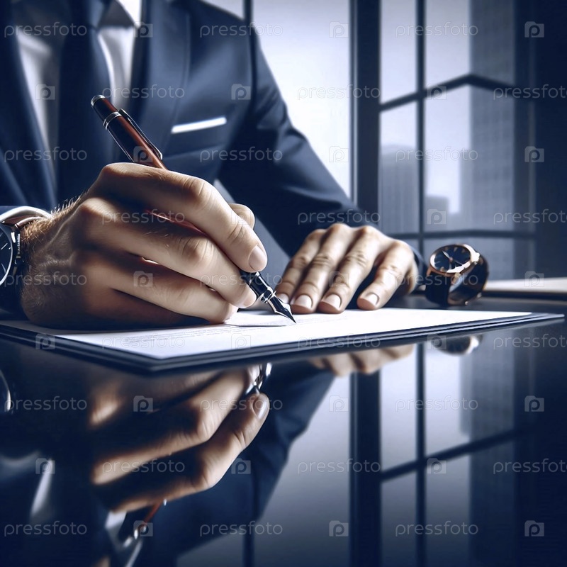 Уверенный в себе предприниматель подписывает крупный контракт, сосредоточившись на решающей руке и ручке