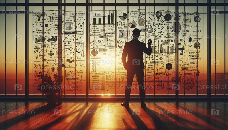 Вдумчивый лидер разрабатывает стратегию, в то время как пишет на стеклянной стене, заполненной схемами и целями