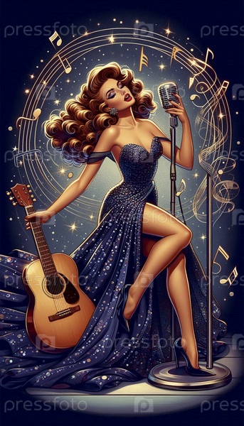 Пин-ап девушка с гитарой, поет в старомодный микрофон, Ai generated image
