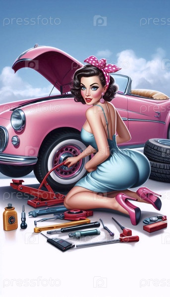 Девушка с ретро-пином, меняющая шину на классическом кабриолете, Ai generated image