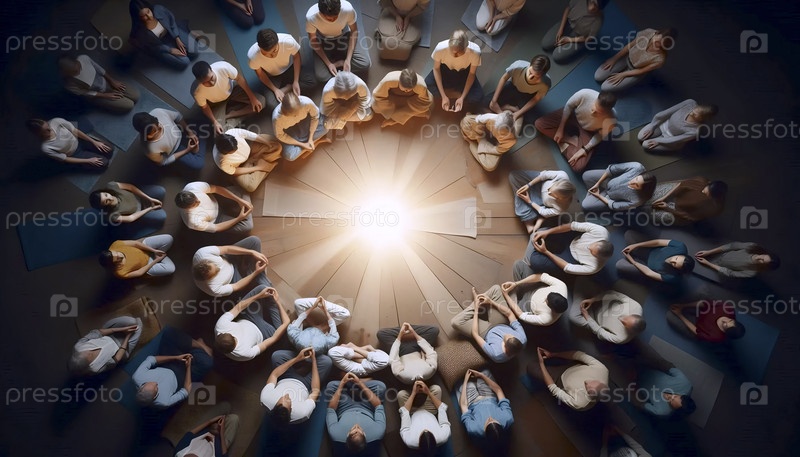 Глубокий момент осознания во время групповой медитации с руководством в спокойной студии, Ай создал изображение