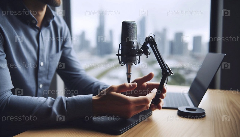 Решительный профессионал готовится к видеозвонку, настраивая высококачественный микрофон с городским пейзажем позади них, Ai generated image