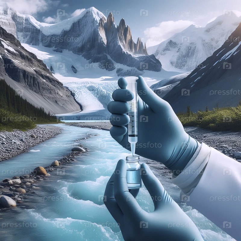 Команда ученых-экологов берет образец воды из нетронутой ледниковой реки, Ai generated image
