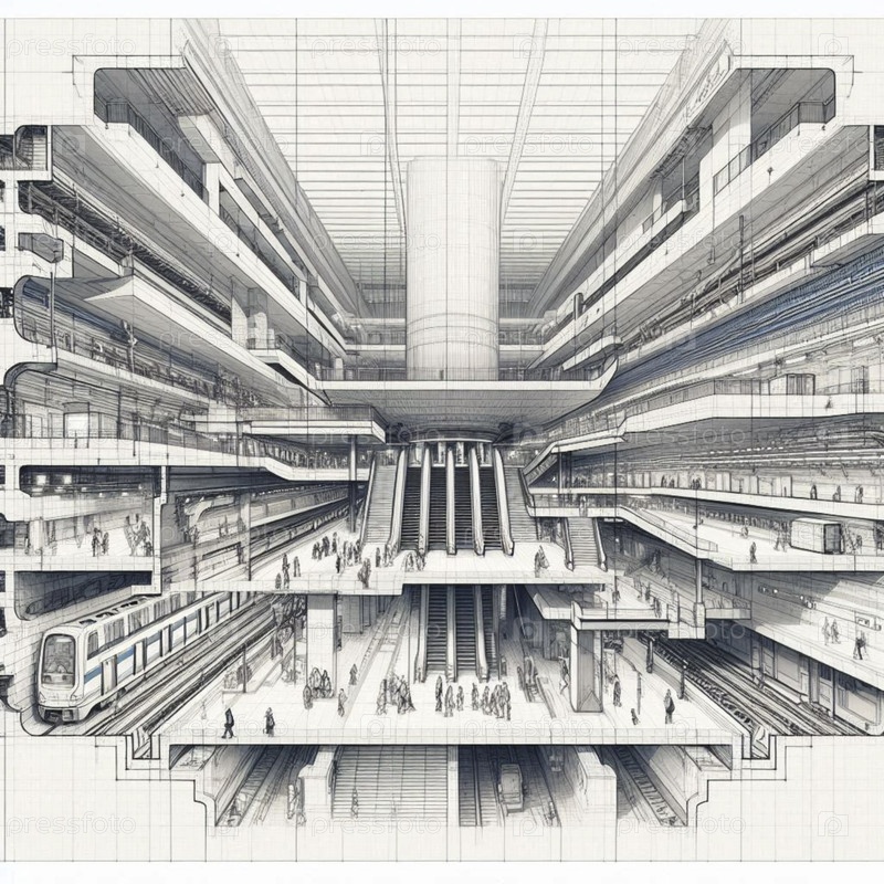 Поперечное сечение станции метро чернильным рисунком художественная печать, Ai generated image