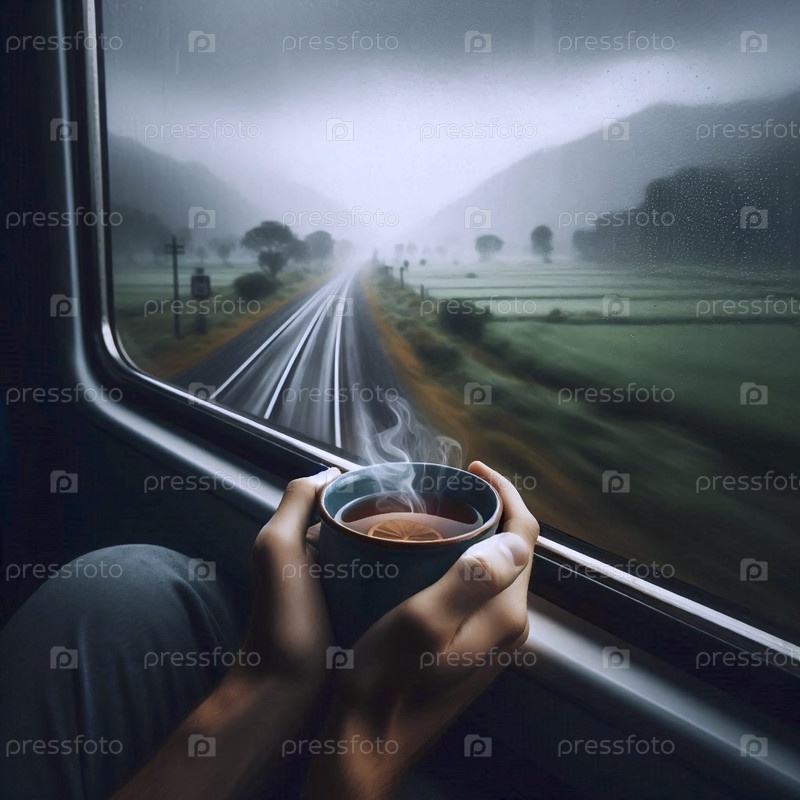 Уютная сцена путешествия: руки держат кипящую чашку чая, смотрят из окна поезда в туманный пейзаж с дождливыми полосками, Ai generated image