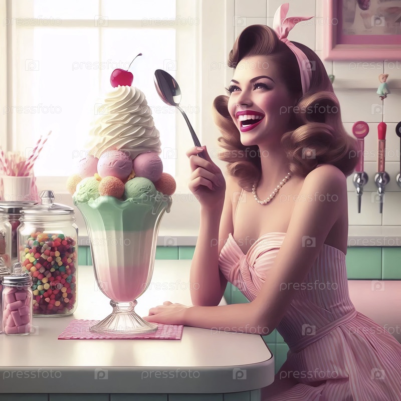 Пин-ап девушка наслаждается гигантским мороженым с удовольствием, Ai generated image