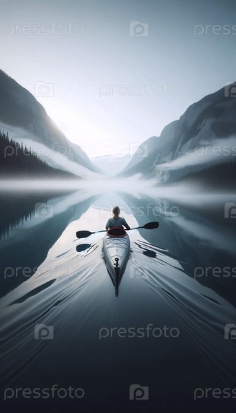 Каякер мира, скользящий по зеркально-спокойному озеру в туманное утро, Ai создал изображение