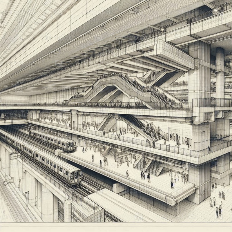 Поперечное сечение станции метро чернильным рисунком художественная печать, Ai generated image