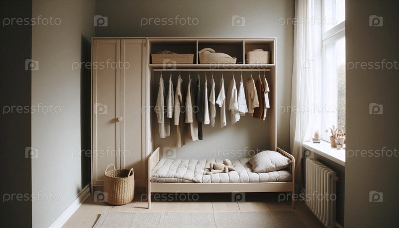 Низкая кровать вдохновлена Монтессори и доступный гардероб, поощряющий независимость ребенка, Ai generated image