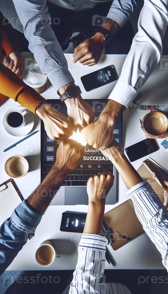 Разнообразная команда празднует успешный запуск проекта с коллективным ударом кулаками по ноутбуку, Ai generated image