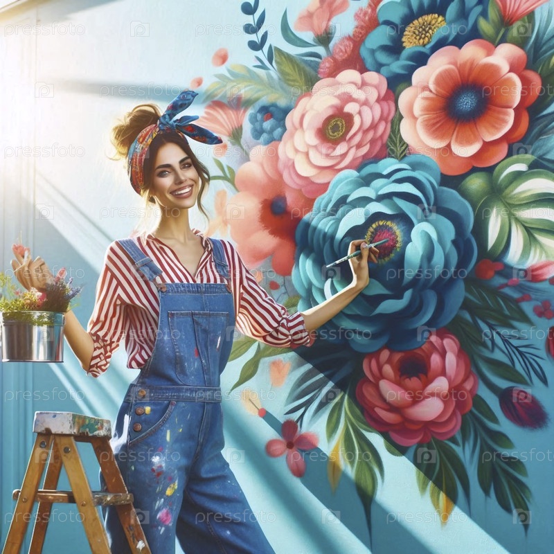 Девушка, нарисованная в качестве художника, украшающего большую стену цветочной росписью, Ай создала изображение