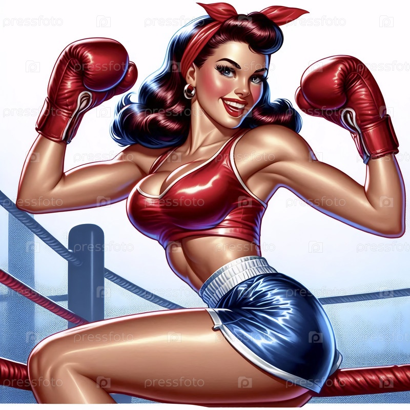 Пин-ап девушка в боксерских перчатках в классической позе борьбы, Ai generated image