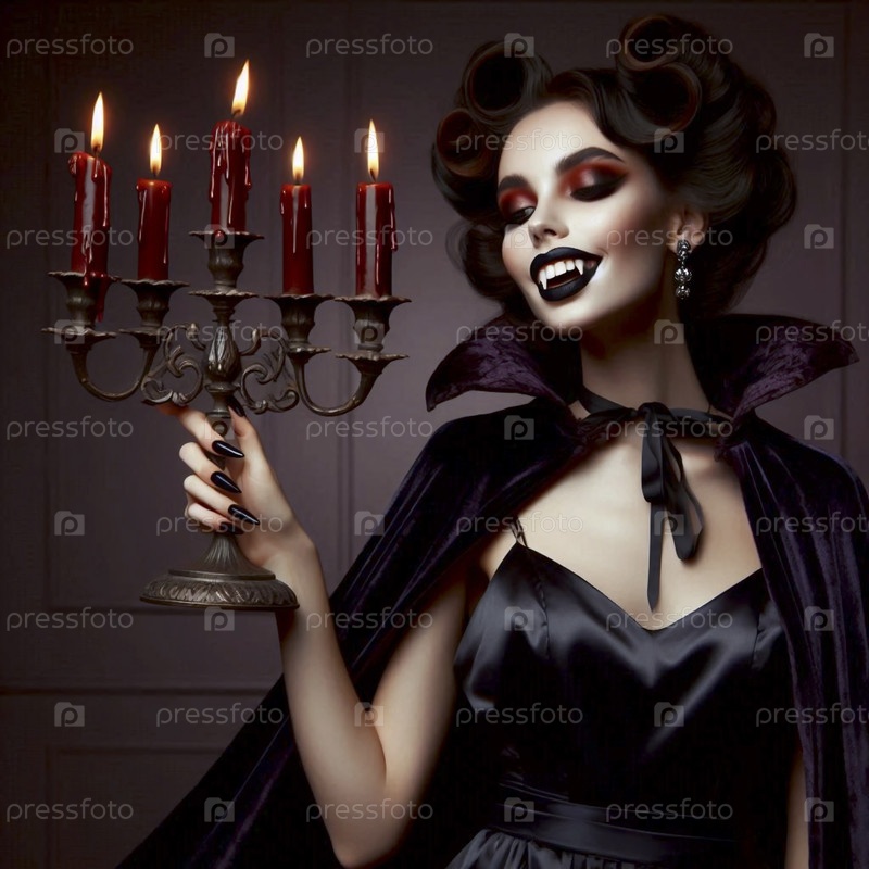 Пин-ап девушка, одетая в вампира на Хэллоуин, держит свечи, Ai generated image