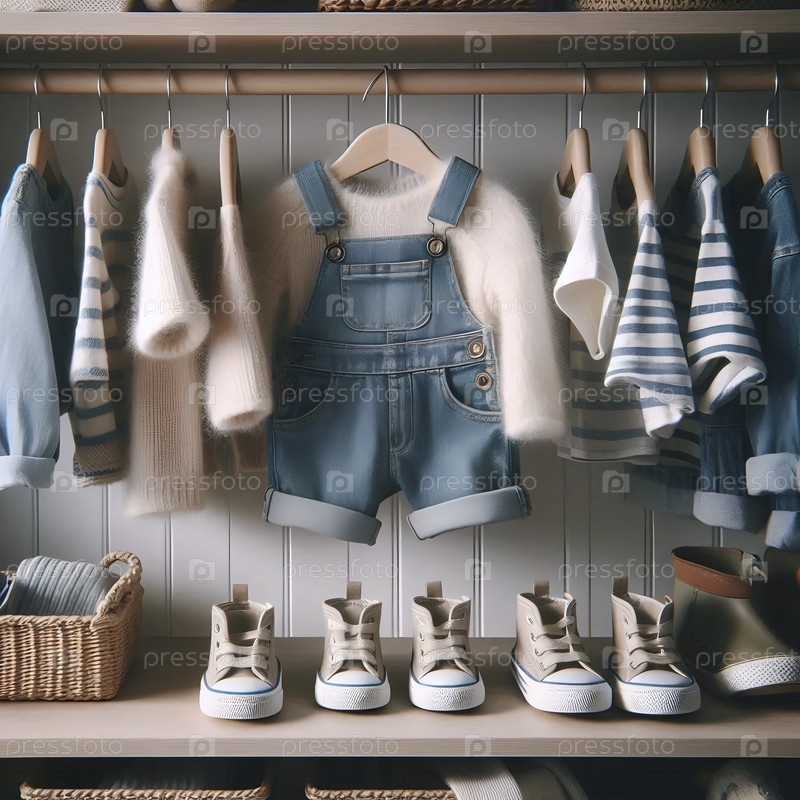 Милый, организованный шкаф с крошечной одеждой на миниатюрных вешальниках и маленькой обувью, выстроенной ниже, Ai generated image