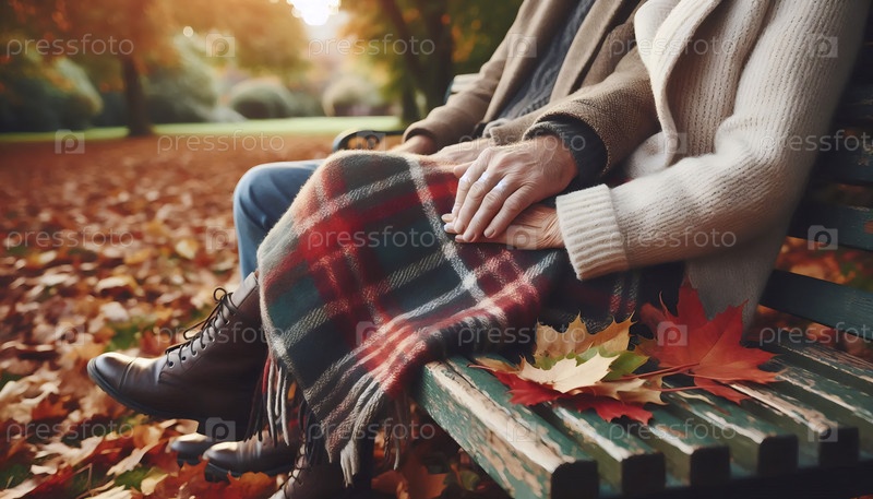 Пожилая пара, сидящая на скамейке в парке с объединенными руками на общем одеяле, Ai generated image
