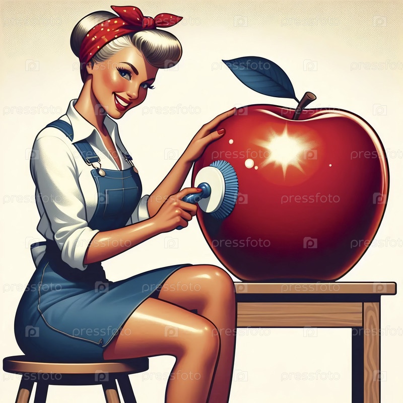 Ретро-пинальная девушка полирует гигантское яблоко, Ai generated image