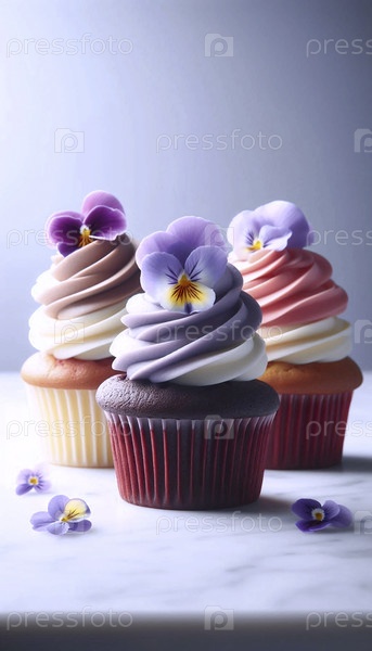 Стол из трех вкусных, безупречно замороженных кексов с небольшим количеством съедобных цветов на мраморной плите Ai создал изображение
