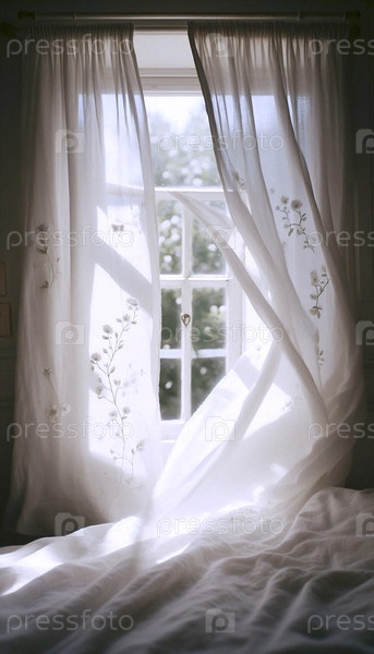 Пара вышитых льняных штор, мягко дующих в ветре от открытого окна, раскрывая солнечный сад, Ай создала изображение