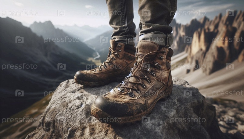 Шаговые сапоги, пыльные и изношенные, отдыхающие на скалистой вершине горы с обширной долиной внизу, Ai generated image