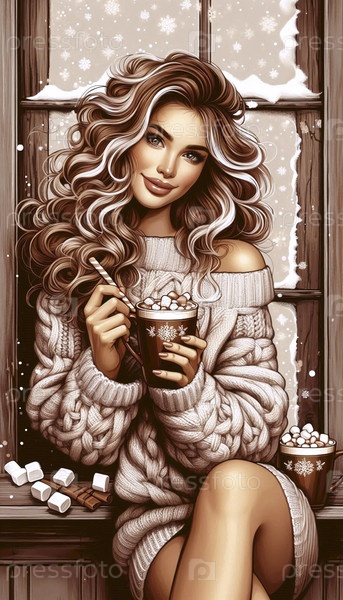 Пин-ап девушка в уютном свитере, держащая две чашки горячего какао, Ai generated image