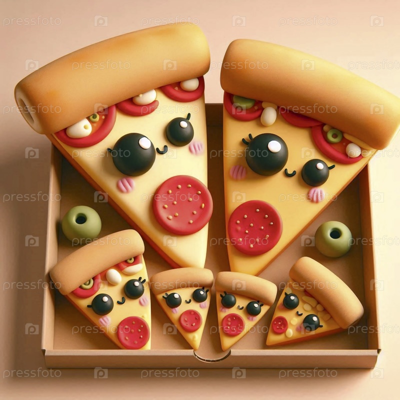 Каваи-сцена семьи с кусочками пиццы, Ai generated image