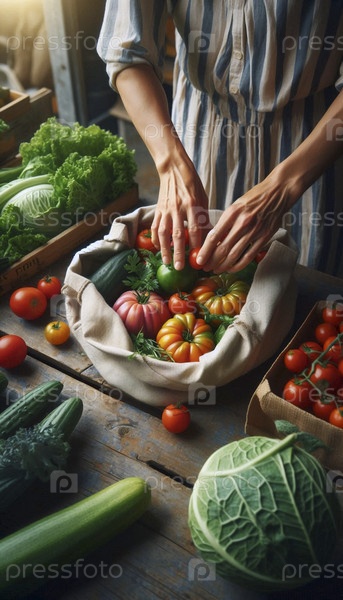Момент устойчивой жизни: руки, использующие многоразовый льняной пакет на киоске фермерского рынка, Ai generated image