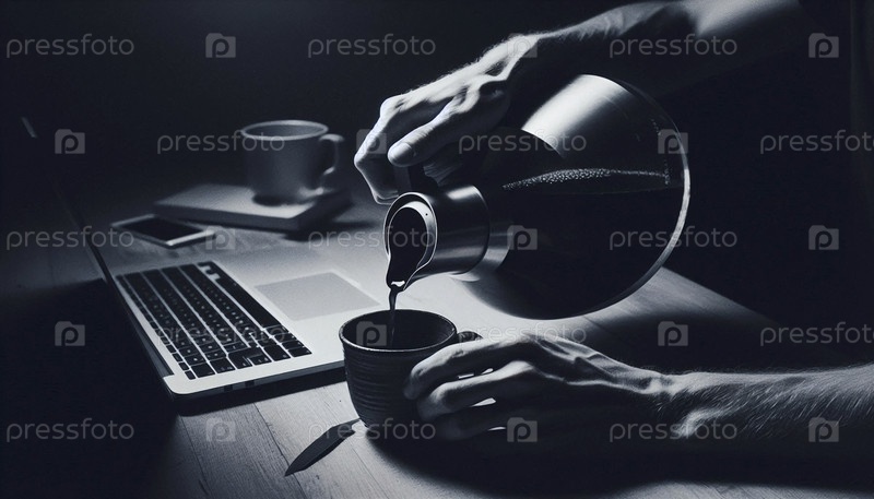Устойчивые предпринимательские руки, слегка уставшие, но стойкие, наливают чашку кофе поздно ночью в минималистичном офисе, Ai generated image