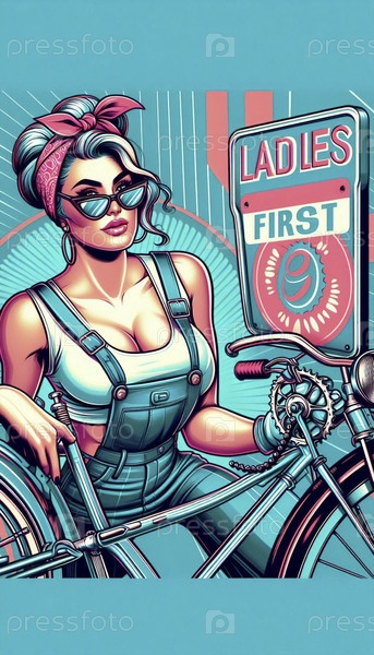 Пин-ап девушка, держащая знак Ladies First во время ремонта велосипеда, Ai generated image