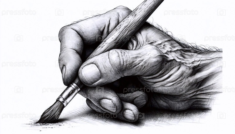 Рука, держащая кисть чернил рисует художественную печать на чёрном цвете, Ai generated image