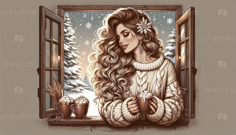 Пин-ап девушка в уютном свитере, держащая две чашки горячего какао, Ai generated image
