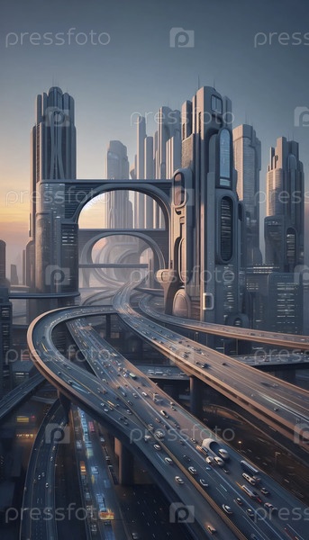 Многоуровневый мегаполис с элегантными летательными аппаратами, ориентирующимися через колоссальные изогнутые эстакады, Ai generated image
