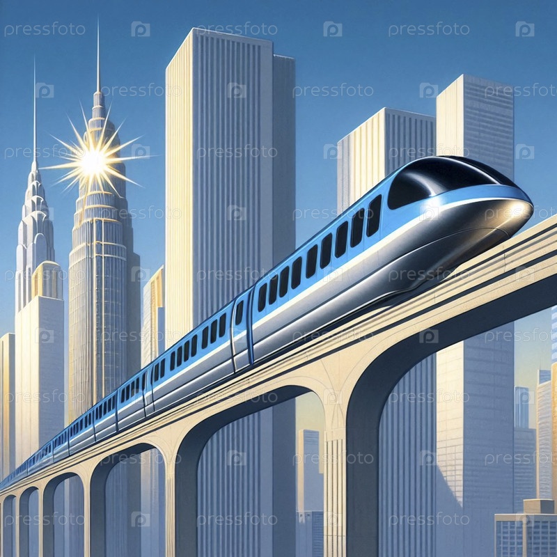 Оптимизированный монорельсовый поезд, плавающий тихо по одной поднятой дорожке через футуристический центр города, Ai generated image