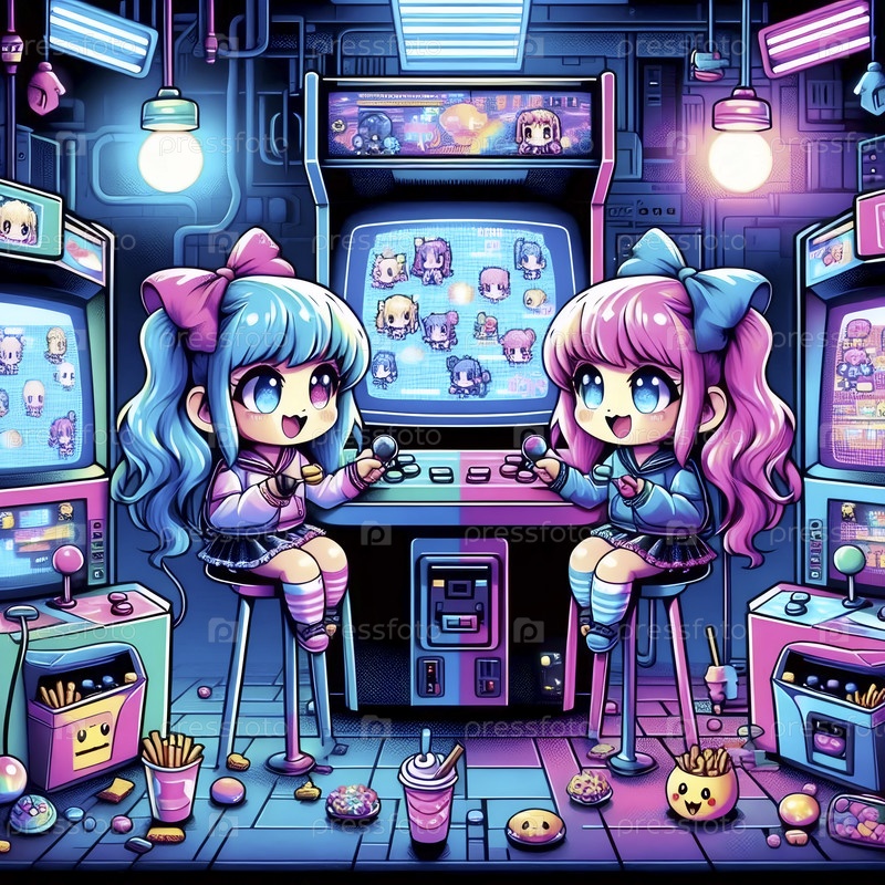 Подробная сцена кавайи в виртуальной аркаде, Ai generated image